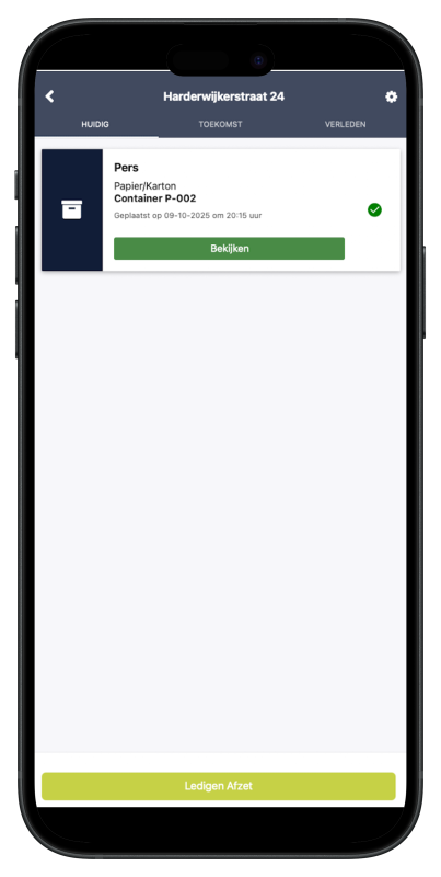 Naast het doorgeven van orders voor het plaatsen/wisselen/ophalen van Afzetcontainers is het nu ook mogelijk om ledigingen van Perscontainers door te geven via de KlantenApp. In de App kan gekozen worden om een volle container op te pakken en te gaan ledigen en daarna meteen weer terug te plaatsen.
